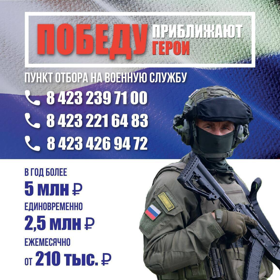 🇷🇺 Контракт с Минобороны РФ Приморье: какие плюсы Добровольцам, которые заключают контракт с Минобороны РФ в Приморья, предлагаются: 🪙 единовременная выплата 2 500 000 рублей и ежемесячная зарплата от 210 000 рублей в месяц 🪖 обучение у опытных инструкторов 🪖 бесплатные проживание, питание, экипировка 📈 срок контракта от 1 года, отпуск каждые 6 месяцев Льготы и возможности: 🔴Статус ветерана боевых действий. 🔴Сохранение рабочего места. 🔴Решение жилищного вопроса. 🔴Кредитные и налоговые каникулы, списание кредитов до 10 млн. 🔴Освобождение от уплаты налога на имущество (один объект каждого вида). 🔴Внеочередное зачисление ребенка в детский сад и в вуз на бюджетной основе. 🔴Освобождение от оплаты за детский сад, бесплатное питание (завтрак и обед) в школе. 🔴Приостановление по судебным делам. ❓ Кто подходит: ✅ Граждане РФ от 18 лет из любого города, можно с судимостью (оформление 2-3 дня). ✅ Наличие военного билета необязательно (восстановление за 2-3 дня). ✅