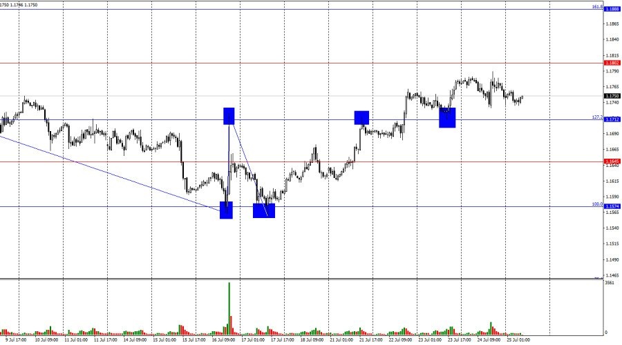 https://basechop.ru/wordpress/?p=51033 Добрый день, уважаемые трейдеры! Пара EUR/USD в четверг торговалась горизонтально. Итоги заседания ЕЦБ практически никак не повлияли на настроение трейдеров, да и сами итоги оказались до ужаса скучными. Таким образом, торги по паре EUR/USD продолжают проходить между уровнями 1,1712 и 1,1802 без отработки этих уровней. Сегодня отбой от любого из этих уровней сработает в пользу движения в противоположную сторону в направлении противоположного уровня. Ситуация с волнами на часовом графике остается простой и понятной. Последняя завершенная волна вниз не пробила лоу предыдущей волны, а последняя волна вверх пробила предыдущий пик. Таким образом, в данное время тренд остается «бычьим», несмотря на длительную коррекцию. Отсутствие реального прогресса в переговорах США с торговыми партнерами, низкая вероятность заключения торговых соглашений с большинством стран и новое повышение тарифов по-прежнему оставляет очень нерадостные перспективы медведям. В…