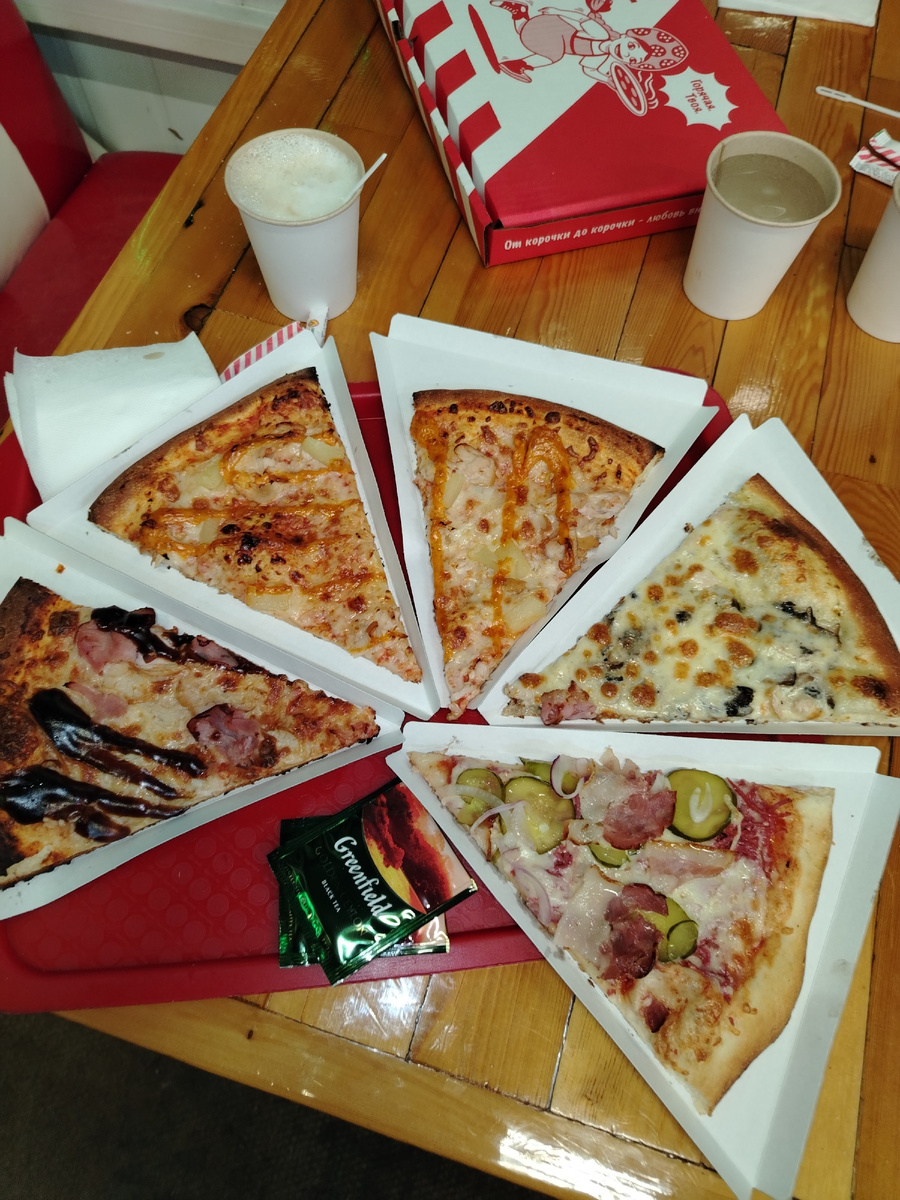 Пицца на любой выбор! Рыбная мясная, с ананасами, пицца бургер(кстати, новинка!), жюльен (излюбленная нами), цезарь, четыре сыра и ещё, я все не упомню сейчас. Цена относительно приемлемая. 600-800 р. за огромную пиццу, с тонким слоем теста и богатым слоем начинки! Так же продаётся кусочками. Сразу скажу-это не реклама, но это лучшая пицца из всех, что заявляют в рекламах. Нашли эту пиццерию мы в подмосковье, сейчас открываются эти пицеррии и в Москве. Берём мы уже там года 3-4. Когда едем на дачу, заезжаем, так же просто, когда едем на рынок. Работает 24 часа. Очень вкусно, увидете, заезжайте - не пожалеете! Кстати, вкусный кофе всего 50 р. Всем пока.