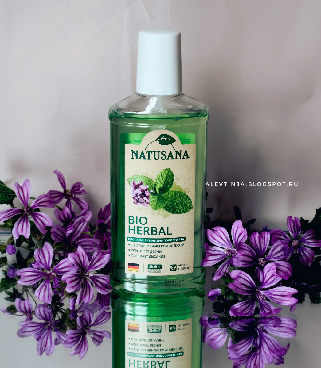 Вслед за ополаскивателем для рта с кальцием от Natusana я тут же купила его травяного братца. Ну а что? Состав хороший, цена более, чем приемлемая. И сейчас коротко о нём расскажу. Заказывала: - в Золотом яблоке В состав положили биокомплекс эфирных масел (эвкалипт, ментол, лимон) и