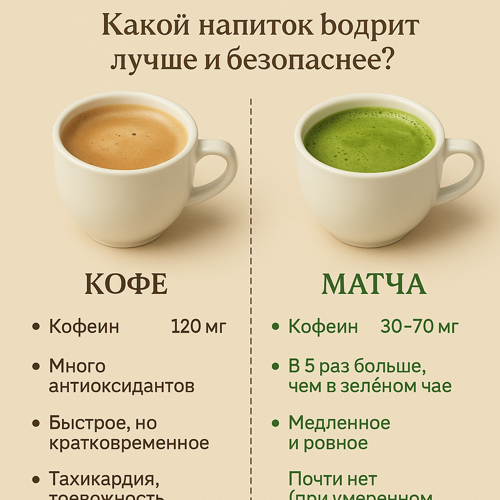Кофе давно стал привычной частью утреннего ритуала миллионов людей по всему миру. Его аромат и мгновенный заряд бодрости — то, за что его любят. Но последние несколько лет на рынке кофеина уверенно держится ещё один игрок — матча, японский зелёный чай в порошке, который многие называют более здоровой альтернативой кофе. Кто из них действительно бодрит лучше, а кто — безопаснее для организма? Разберёмся без мифов. Кофе содержит кофеин в концентрации от 80 до 120 мг на чашку (в зависимости от сорта и объёма). Кофеин быстро всасывается в кровь, проникает в мозг и блокирует аденозин — вещество, вызывающее сонливость. Эффект наступает быстро, но так же быстро и сходит на нет, часто оставляя после себя «энергетическую яму» и усталость. Матча тоже содержит кофеин (около 30–70 мг на порцию), но действует мягче. Всё дело в аминокислоте L-теанин, которой в матча очень много. Теанин снижает тревожность и замедляет высвобождение кофеина, давая эффект "ровной бодрости", без скачков и падений энерг