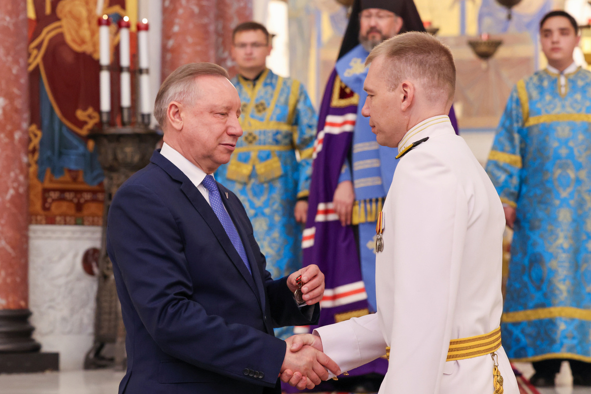 После молебна губернатор вручил памятные знаки "За участие в специальной военной операции от благодарного Санкт‑Петербурга" присутствовавшим на богослужении участникам СВО.