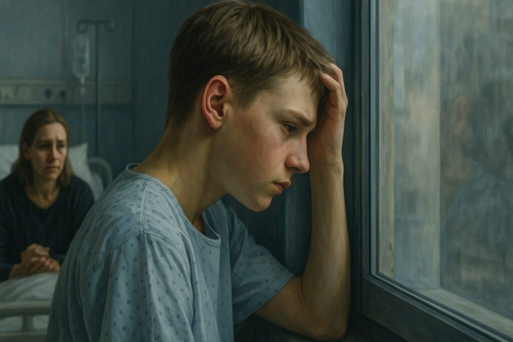Мать сидела рядом, держала его за руку. Лицо заплаканное, но взгляд жёсткий.