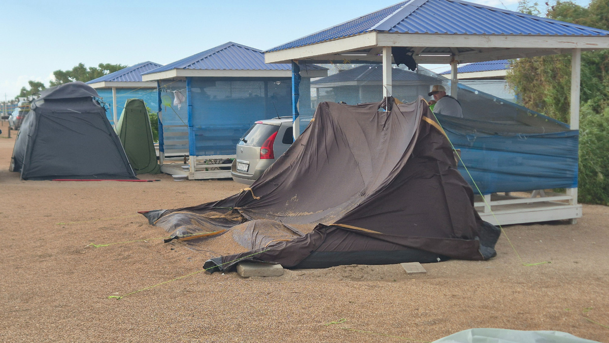 Всем привет! В первый день нашего путешествия на Азовское море, в станице Должанской погода преподнесла неожиданный сюрприз! Резко усилившийся ветер буквально прижал несколько палаток к домикам на берегу моря! Плохая погода длилась буквально полтора часа, а впечатления остались навсегда! Современные палатки легко восстановить - легкие стойки можно просто заказать на маркетплейсах. Погода сжалилась над курортниками и в кемпинге вновь засветило солнце! Азовское море стремительно успокоилось. И уже к вечеру небо вновь было ясным, а море спокойным! Нам на память осталось несколько фотографий. Наша палатка низкая и спокойно пережила шквалистый ветер.