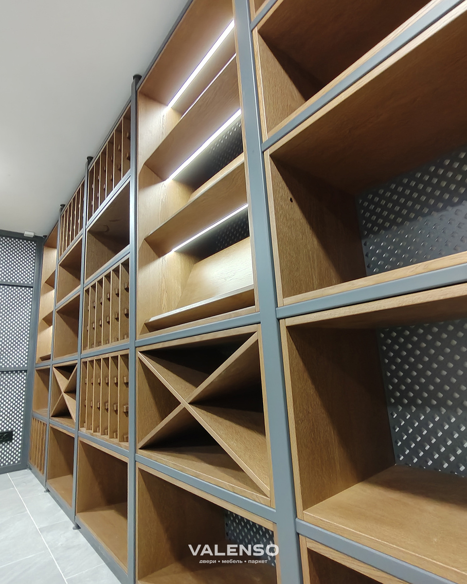 Мебель для винного погреба состоит из различных элементов и модулей. В её основе — металлический каркас, формирующий структуру и обеспечивающий прочную, стабильную базу. Он не подвержен деформации, коррозии и воздействию влаги. Каркас окрашен в цвет, заданный дизайнером, что позволяет точно вписать конструкцию в общий образ интерьера и визуально подчеркнуть архитектурную идею. Дополнительное крепление осуществляется к полу и потолку, что обеспечивает необходимую жёсткость и устойчивость всей системы. Перфорированные металлические панели завершают конструкцию. Они выполняют роль задней стенки и одновременно служат декоративным элементом, придающим объёму структуре и добавляющим характер. Внутри секций — элементы для хранения бутылок разных форматов. Все они выполнены в отделке из шпона натуральных пород, а также используются вставки из массива дерева. В результате получилась цельная и выразительная композиция, в которой дизайн органично сочетается с продуманной функциональностью. Авто