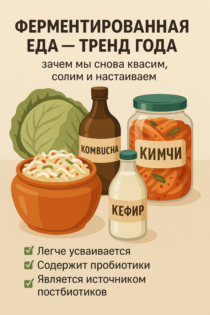 Когда в 2020-х годах все начали печь хлеб с закваской, казалось, это временное увлечение. Но вот 2025-й — и ферментированная еда не просто вернулась, а уверенно вошла в топ гастрономических трендов. Домашний кимчи, квашеная капуста, комбуча и соевый мисо — всё это сегодня не просто диковинки с фермерского рынка, а часть повседневного рациона всё большего числа людей. Почему это происходит и зачем вообще возвращаться к древним способам заготовок?