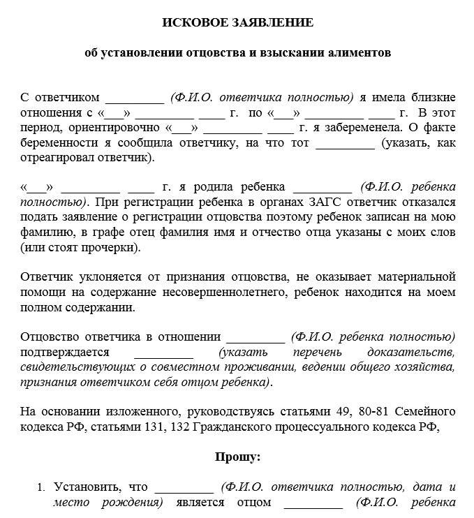 Образец искового заявления об установлении отцовства и взыскании алиментов