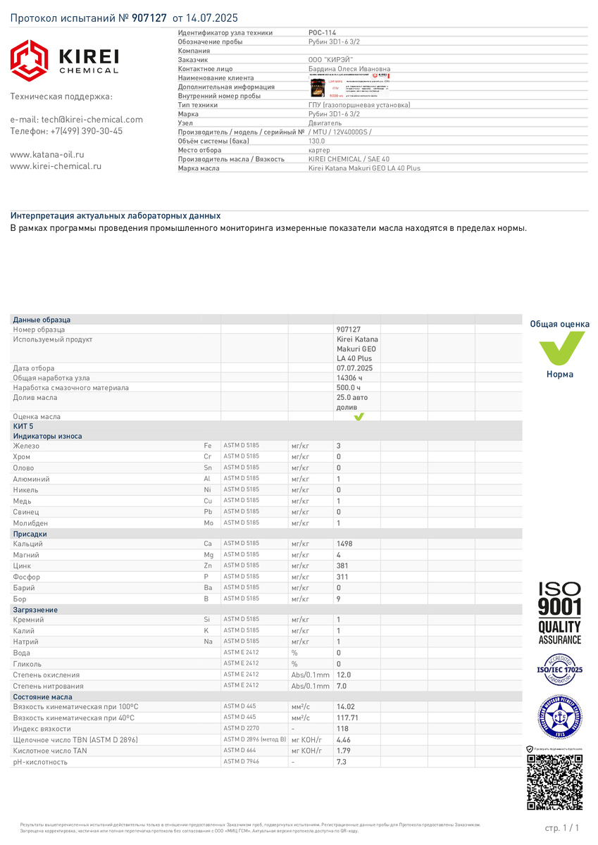 В середине июля промышленное предприятие в РО приняли решение закупить KATANA MAKURI GEO LA 40 Plus. Работали на масле отечественного производителя после капитального ремонта. Очень поучительная история для людей, кто в нынешних условиях искренне верит, что с импортными маслами в их ГПУ всё будет отлично, произошла с этой компанией. Когда наша страна оказалась под санкциями, компания которая поставляла им импортные масла не смогла предоставить схожий продукт и по ряду причин(немалую роль при этом , сыграло контрафактное масло) производство попало на капитальный ремонт при наработке менее 12000 м/час.! Поставщики сделали шаг в сторону и оставили производство самостоятельно разбираться с ситуацией. Именно для того, чтобы партнёры были уверенны в исправности своего двигателя, а так же в том, что при возникновении каких либо проблем по вине газового масла, компании ПетроМаркетПлюс и Кирей Кемикал при заливке масла KATANA MAKURI GEO LA 40 Plus в двигатель нового партнёра предлагают программ