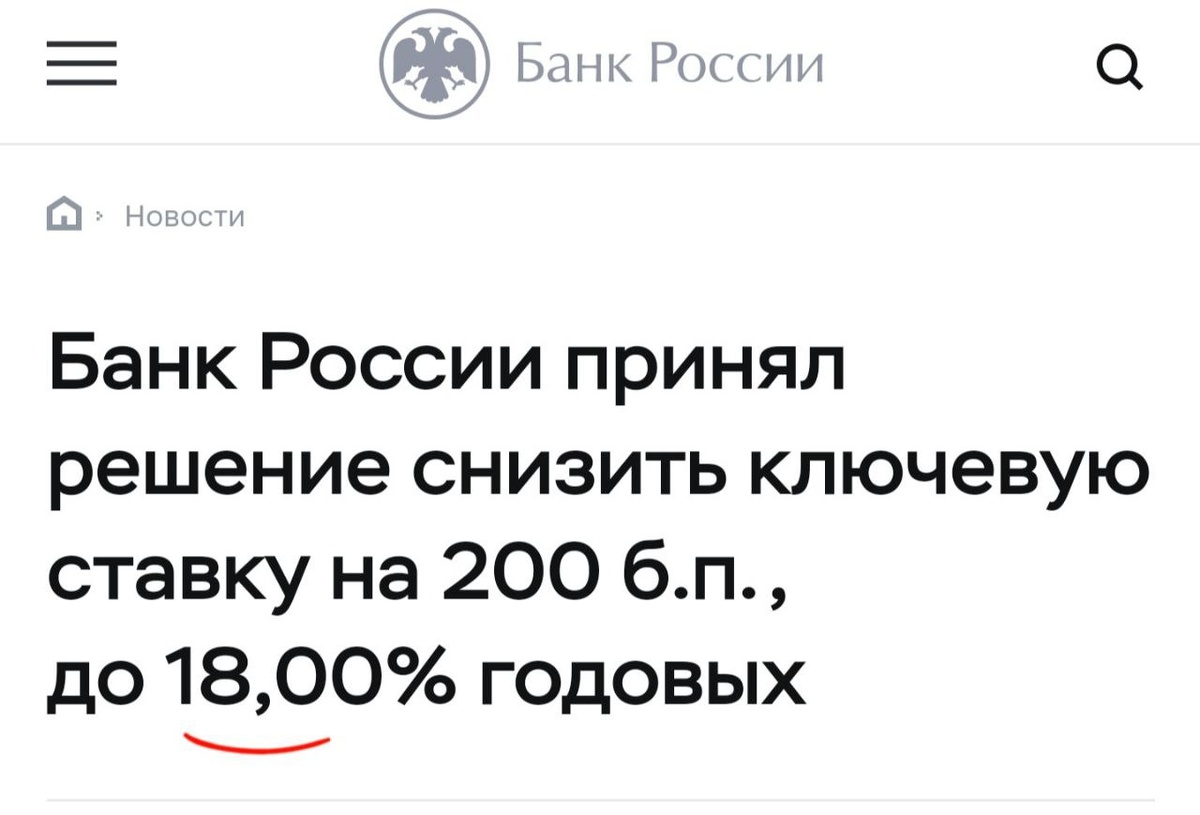 Совет директоров Банка России 25 июля 2025 года принял решение снизить ключевую ставку на 200 б.п., до 18,00% годовых