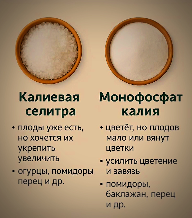 ➡️ Минимум азота — иначе будет ботва вместо плодов! Удобрение Когда Дозировка 🟡 Калиевая селитра Плоды уже есть 1 ст. л. на 10 л воды → 0,5 л под куст. 🟠 Монофосфат калия Цветёт, но завязи мало 1 ч. л. на 10 л воды → опрыскать листья. *«Чередую так: сначала селитра под корень (когда завязались перцы), через 10 дней — монофосфат по листу. Так и в жару +35°С плоды не горят!»* Важно! Если перекормили — выждать 10 дней. ❓ «Можно ли заменить монофосфат золой?»