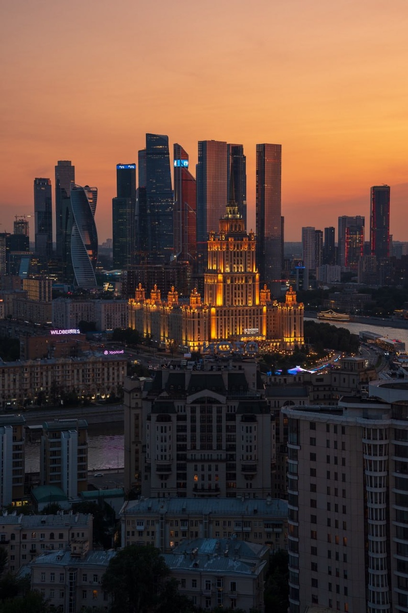 Пара кадров с участием небоскрёбов «Москва-Сити», гостиницей «Украина», жилого комплекса «RED 7» и другими объектами.