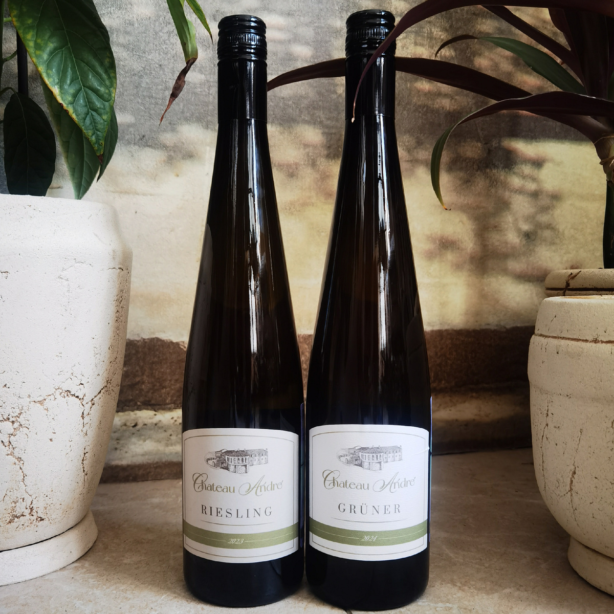 О заслуживающих внимания винах от Chateau Andre я писал совсем недавно. И вот, после неожиданно удачного совиньона и приятного розового (по вполне разумной для вин подобного уровня цене), захотелось попробовать что-то ещё. Весьма кстати, с разницей в несколько дней попались в рознице на глаза вина из рислинга и грюнера, которые и по оформлению оказались похожи и по погоде подошли в самый раз. Эльзаская флейта с этикеткой на латинице в данном случае - тот редкий случай, когда применительно к российскому вину это не вызывает особого недовольства и недоумения. Смотрится умеренно строго и относительно солидно - так сразу и не поймёшь откуда же вино родом. На фото не видно, но этикетки на самом деле разные: у грюнера бумага гладкая, белая, у рислинга фактурная, с серо-бежевым оттенком. Я достаточно равнодушно отношусь к грюнеру и конечно потягаться с австрийскими мало кому дано. Тем более было интересно чем же удивит в данном случае Chateau Andre. Гюнер 2024 года. Сортовой состав 10