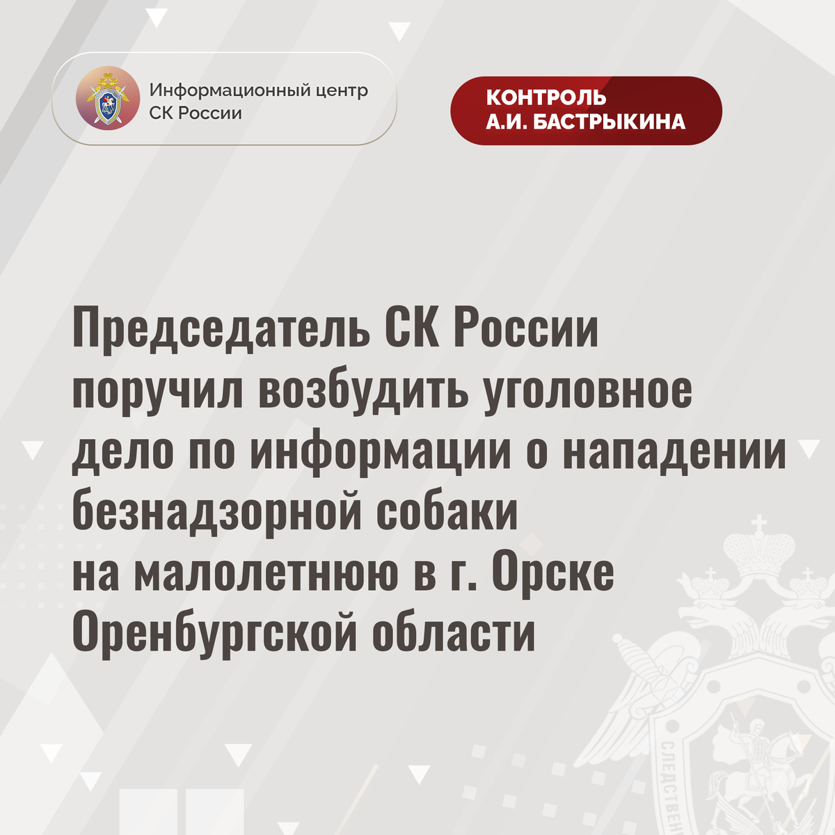 Председатель СК России поручил возбудить уголовное дело по информации о нападении безнадзорной собаки на малолетнюю в г. Орске Оренбургской области В приемную Председателя СК России А.И. Бастрыкина «ВКонтакте» обратилась жительница Оренбургской области по вопросу нападения безнадзорной собаки на ее восьмилетнюю дочь в городе Орске. 20 июля текущего года на территории детской площадки агрессивное животное напало на девочку и укусило за руку. Пострадавшей потребовалась медицинская помощь. В СУ СК России по Оренбургской области организована процессуальная проверка. Председатель Следственного комитета Российской Федерации Александр Иванович Бастрыкин поручил руководителю СУ СК России по Оренбургской области Вячеславу Давидовичу Зудерману возбудить уголовное дело и представить доклад о ходе и результатах его расследования. Исполнение поручения поставлено на контроль в центральном аппарате ведомства. #СледственныйКомитет #СКРоссии #СКР #ИЦСКР #ИнформационныйЦентр #КонтрольПредседателяСКР #К