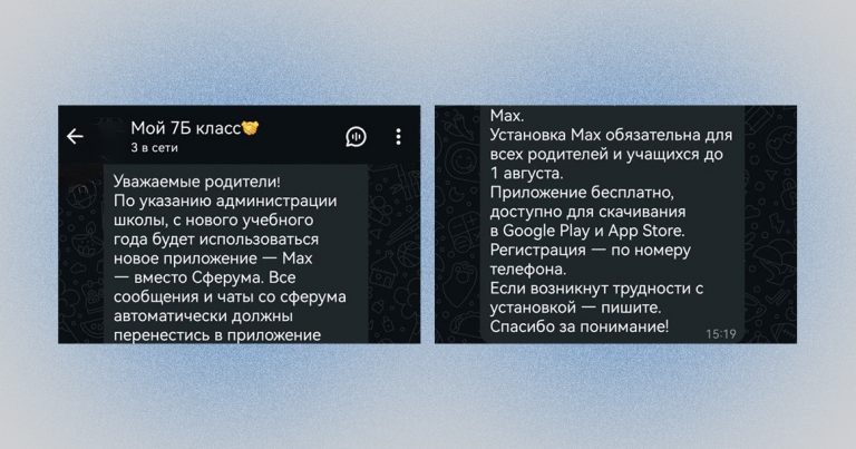 Родителям и школьникам стали приходить сообщения от администрации школ с требованием установить новый «национальный» мессенджер Max, информация об этом появилась в московских телеграм-каналах. Он должен заменить платформу «Сферум», которая ранее использовалась для школьных чатов, уведомлений и рассылок. Сообщения появляются в родительских чатах: в них говорится, что установка Max обязательна и должна быть завершена до 1 августа. Представители учебных заведений говорят, что все чаты и сообщения со «Сферума» будут перенесены автоматически. «Уважаемые родители, по указанию администрации школы с нового учебного года будет использоваться новое приложение Max. Установка обязательна до 1 августа. Если возникнут трудности — пишите», — говорится в одном из сообщений. Некоторые родители уже выразили недовольство подобным подходом. «Купить отдельный телефон для этого мессенджера, пользоваться только в школе и для школы, выключать в авиарежим после», — комментирует один из телеграм-пользователей.