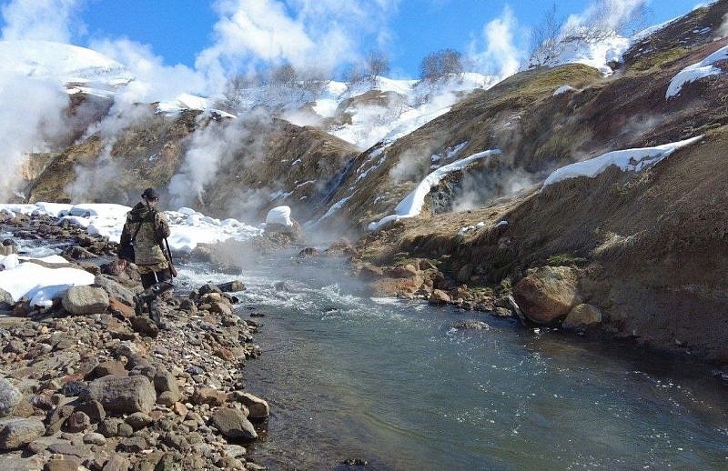 в парящее ущелье неизвестной тёплой реки, которую впоследствии назвали Гейзерной, передаёт РАИ «КАМЧАТКА-ИНФОРМ». Каньон с десятками фумарол, гейзеров и пульсирующих источников они обнаружили накануне, 24 июля. А первый гейзер Долины, который потом так