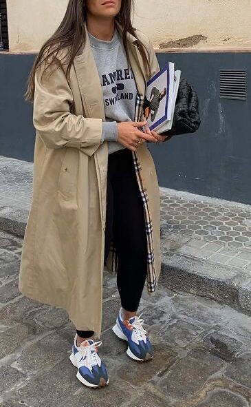 Спорт-Шик: Накинь поверх комплекта худи оверсайз + черные легинсы/велосипедки + массивные кроссовки. Пояс тренча не завязывать, накинуть небрежно.