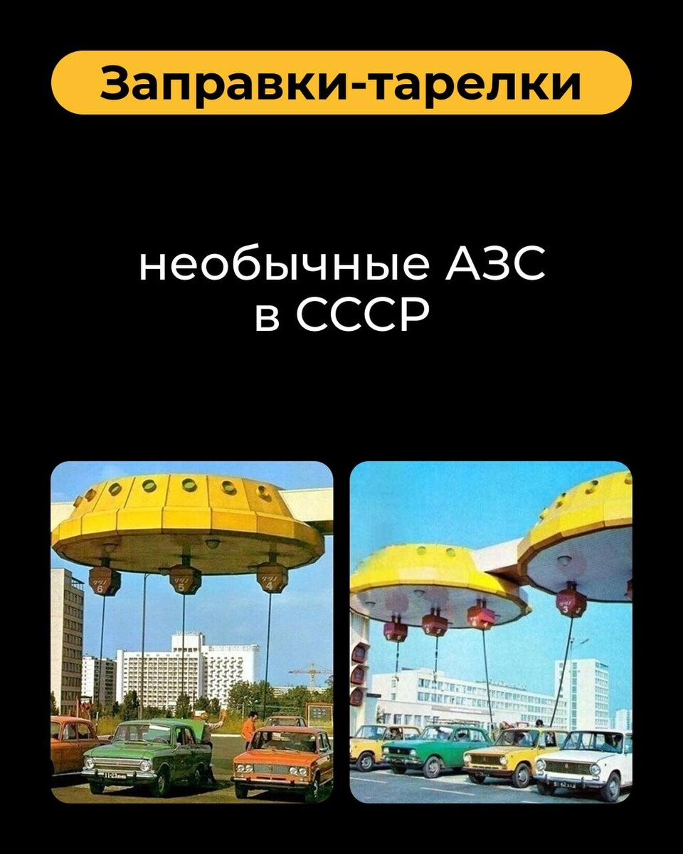 В СССР экспериментировали не только с космосом, но и с автозаправками! В 80-е появились станции, похожие на летающие тарелки. Их главная фишка — топливные шланги, подвешенные к потолку, чтобы можно было заправлять машины с любым расположением бака. • Удобно? Безусловно — не надо думать, с какой стороны подъехать. • Безопасно? Увы, нет. Именно из-за рисков такие АЗС не получили массового распространения. Как вам такой дизайн? Хотели бы, чтобы сейчас вернули что-то подобное, но с современными технологиями?