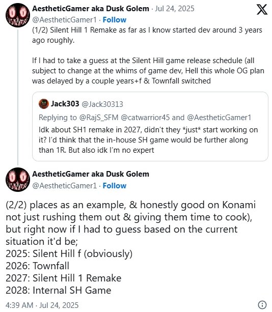 Известный инсайдер Dusk Golem, пользующийся доверием в сообществе фанатов хоррор-игр, поделился предполагаемой дорожной картой релизов игр из франшизы Silent Hill. Согласно его данным, Konami планирует ежегодные выпуски новых проектов вплоть до 2028 года. В 2025 году, как все мы уже и так знаем, ожидается выход Silent Hill f — новой игры, действие которой развернется в Японии 1960-х годов, с героиней Хинако Симидзу, созданной студией NeoBards Entertainment и сценаристом Рюкиши07. В 2026 году запланирован релиз Silent Hill: Townfall, спин-оффа от Screen Burn Interactive и Annapurna Interactive, о котором особо ничего не известно. В 2027 году может выйти ремейк оригинальной Silent Hill, а в 2028 году — еще одна внутренняя разработка Konami, детали которой пока не раскрываются. После успеха ремейка Silent Hill 2 в 2024 году, Konami демонстрирует приверженность возрождению серии, но инсайдер подчеркивает, что даты — это лишь предположения, так как разработка может затянуться. Однако ремейк