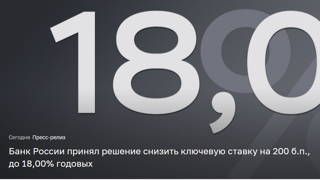 Прошло очередное заседания совета директоров Банка России, где было принято ожидаемое большинством аналитиков и рынком снижение ставки на 2% до 18% Также на этом заседании совет директоров пересматривал свой макроэкономический прогноз на ближайшие три года. По инфляции и ставки изменения следующие: Инфляция (декабрь к декабрю): Средняя ключевая ставка: Исходя из значения средней ключевой ставки 20.8% до 27 июля, до конца средняя ключевая ставка составит 16,3–18,0%. Удачи и трезвого анализа в ваших инвестициях!!! P.S. Подписывайтесь на мой телеграмм-канал: https://t.me/Cervonets