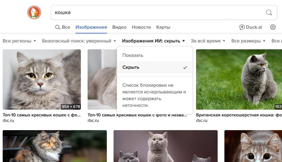 Поисковая система DuckDuckGo представила функцию для удаления ИИ-генерируемых изображений из результатов поиска