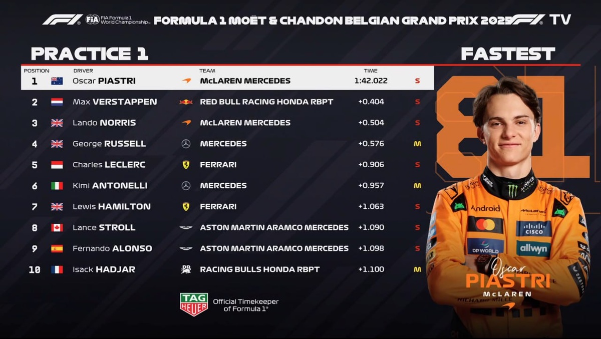 Результаты практики гран-при Бельгии: Быстрейшие Макларены, настроенные на больший прижим, в то время как Макс с лучшими 1 и 3 секторами за счет настройки на меньший прижим проигрывает на 2 секторе всё, что выиграет на скоростных секторах и ещё 0,4с сверху. Феррари пока эффективность своего обновления не показали.