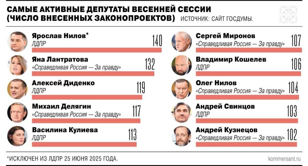 Подведение итогов весенней сессии Госдумы в цифрах и по сути. На фоне закрытия сессии Госдумы, самое время подвести итоги работы ЛДПР. Тем более, что в этом политическом сезоне я, как и многие коллеги политологи, наблюдаю за фракцией особенно пристально. 🔸 В цифрах и обзорах коллег, всё выглядит внушительно: 209 законодательных инициатив - это больше, чем в аналогичный период прошлого года. Принято - 85. В активной работе - ещё 163. Плотная повестка по миграции, поддержке СВО, социальной политике, демографии. Участие в соавторстве с другими фракциями. Форумы, выездные заседания, масштабные мероприятия. По соцопросам - 11,7%, второе место после «Единой России». 📊 Но если мы посмотрим на источник этой активности, то увидим кое-что важное. Вот, например, таблица самых активных депутатов Госдумы по итогам весенней сессии (данные сайта Госдумы, не мои): 🥇На первом месте - Ярослав Нилов (140 законопроектов). С отрывом. Системно. По всем ключевым направлениям: труд, миграция, пенсии,
