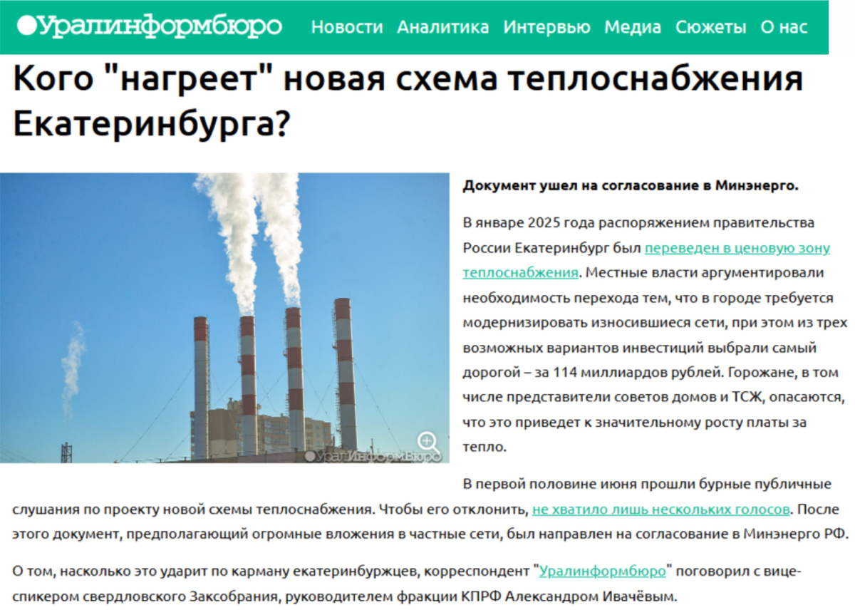 В январе 2025 года распоряжением правительства России Екатеринбург был переведен в ценовую зону теплоснабжения. Местные власти аргументировали необходимость перехода тем, что в городе требуется модернизировать износившиеся сети, при этом из трех возможных вариантов инвестиций выбрали самый дорогой – за 114 миллиардов рублей. Горожане, в том числе представители советов домов и ТСЖ, опасаются, что это приведет к значительному росту платы за тепло.