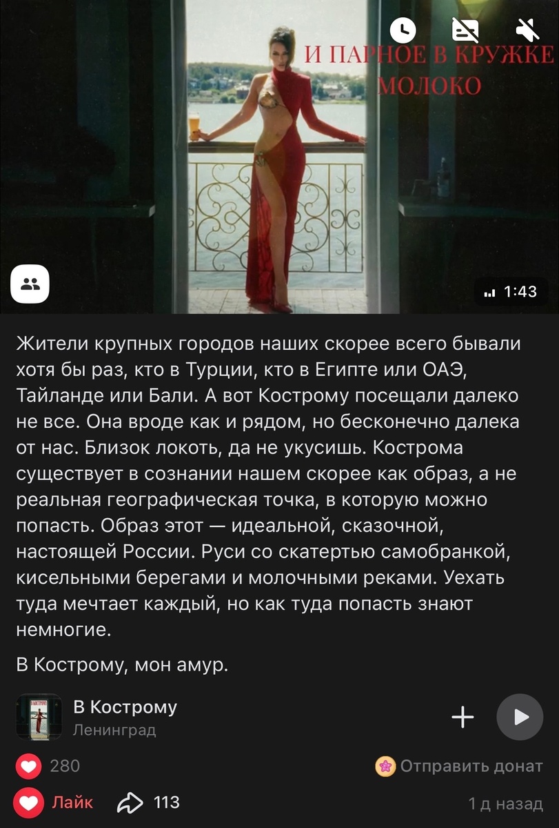 В своем обращении вокалист подчеркнул, что Кострома в глазах жителей столичных городов — идеальный и сказочный образ. Здесь скатерть самобранка, кисельные берега и молочные реки. Каждый мечтает попасть на Родину Снегурочки, но далеко не все знают, как это сделать.