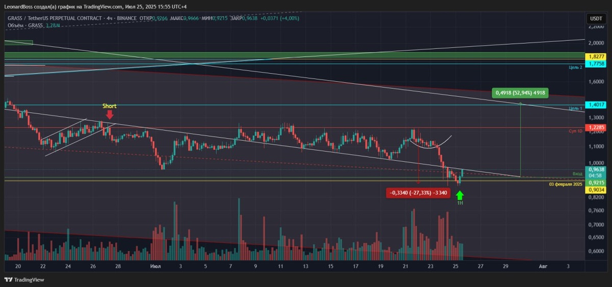 #GRASS 🔼🔼🔼 ⚠️Мощно укатали, даже как-то удивительно, если только перед сильным пампов. Сильнейший актив направления DePin. Тут много говорить не о чем, всё видно на графике, можно лишь отметить, что цена таки протестировала уровень слива от 3 февраля, где большинство активов побывали уже давно. Это вам еще одно подтверждение того, как мощные сквизы, вернее из Low, в последующем превращаются в уровни притяжения цены. Цели среднесрочные минимальные на графике!! P.s. прямо над головой уровень 1$ и выход обратно на трендовую. Можно дождаться этого события + закреп + покупка. Если случится повторный откат и реакция на 4Н от последнего Low, покупка = must have!!!
