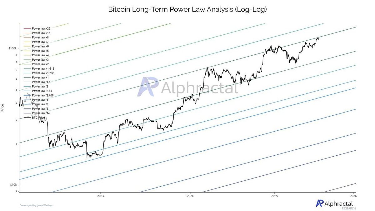 Bitcoin упёрся в сопротивление по Power Law — развязка близко Редкий, но мощный индикатор для оценки долгосрочной траектории BTC Инвесторы, на графике выше — один из самых недооценённых, но точных индикаторов для биткоина: Long-Term Power Law Analysis в формате log-log. Что это такое? — Горизонтальный масштаб — логарифм времени — Вертикальный масштаб — логарифм цены — Поверх этого — степенные линии (Power Laws), выведенные через регрессию Это даёт структурированную «сетку» поддержки и сопротивлений, в которой BTC движется с удивительной точностью уже более 10 лет. Что сейчас? — Цена биткоина снова приблизилась к ключевому верхнему каналу — По этой модели, зона $122,000 — это долгосрочное сопротивление, над которым BTC ещё ни разу не закреплялся — Для настоящего бычьего прорыва нужно пробить и удержаться выше этой линии Если это произойдёт — начнётся фаза, которую модель до этого не видела. Если нет — высока вероятность отката внутри канала, как это было в 2013, 2017 и 2021.