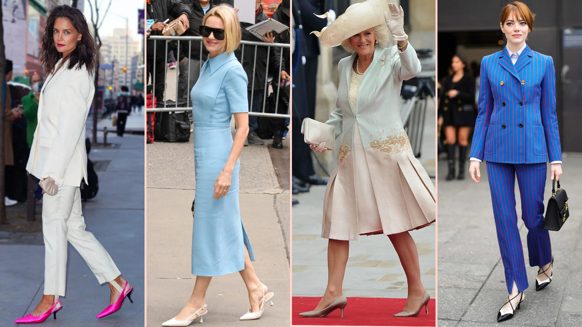 Кэти Холмс доказала, что туфли на микрокаблуках действительно могут стать ярким акцентом, когда в марте 2022 года вышла на улицы Нью-Йорка в неоново-розовых слингбэках. Она надела яркую обувь с приталенным блейзером и брюками.