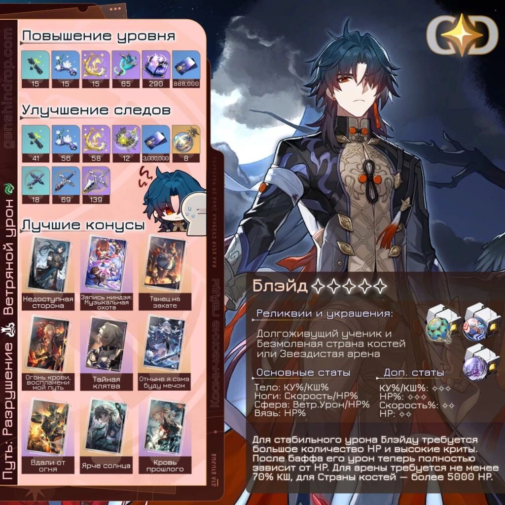 ㅤБлэйду необходимы HP и криты — от этих показателей напрямую зависит весь его урон. Скорость в его сборке ситуативна: её можно не набирать вовсе, а можно сделать его сборку «скоростной», если это будет не в ущерб остальным характеристикам.