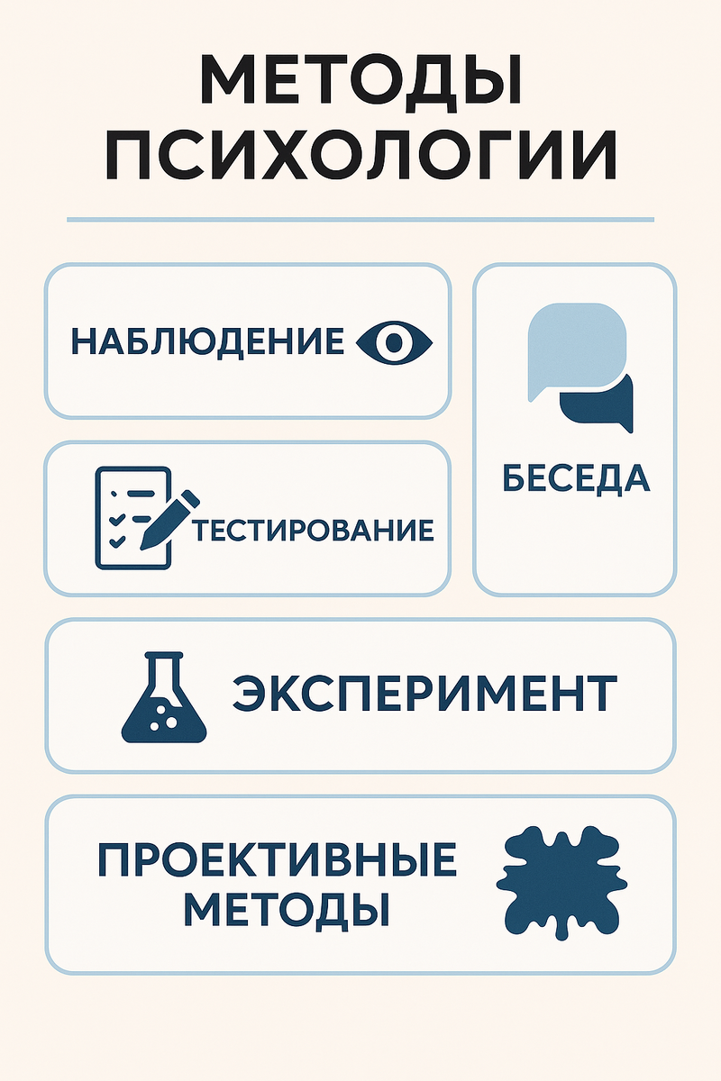 Психология — это наука о поведении, сознании и внутреннем мире человека. Чтобы изучать столь сложные явления, психология разработала целый арсенал методов. Каждый из них имеет свою цель, область применения и ограничения. В этой статье рассмотрим основные методы психологического исследования: от классических наблюдений до экспериментальных и проективных техник. Классификация методов психологии Все методы психологии можно условно разделить на три группы: Основные эмпирические методы 1. Наблюдение Это один из самых древних и фундаментальных методов. Психолог фиксирует поведение человека в естественных или специально созданных условиях. Плюсы: – ненавязчивость; – возможность изучения реального поведения. Минусы: – субъективность; – отсутствие контроля над ситуацией. Пример: наблюдение за поведением ребёнка в группе сверстников. 2. Беседа Целенаправленное общение между психологом и клиентом (или испытуемым), где задаются вопросы, уточняются детали и строится по