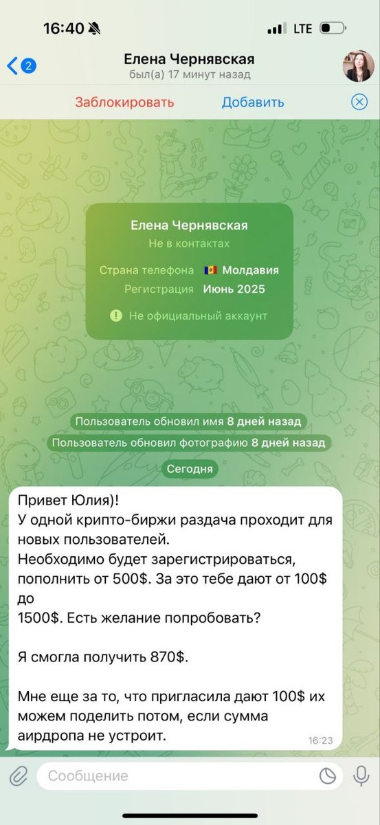 Важно ❗❗❗❗ От моего имени пишут мошенники ❗❗❗❗ Я не приглашаю ни в какие проекты, не беру деньги в управление и не обещаю быстрых заработков! Блокируйте и жалуйтесь на спам. И ни в коем случае не переводите деньги. Это создан фейковый аккаунт с моим фото и именем Мой ник в тг @elena_o_finance