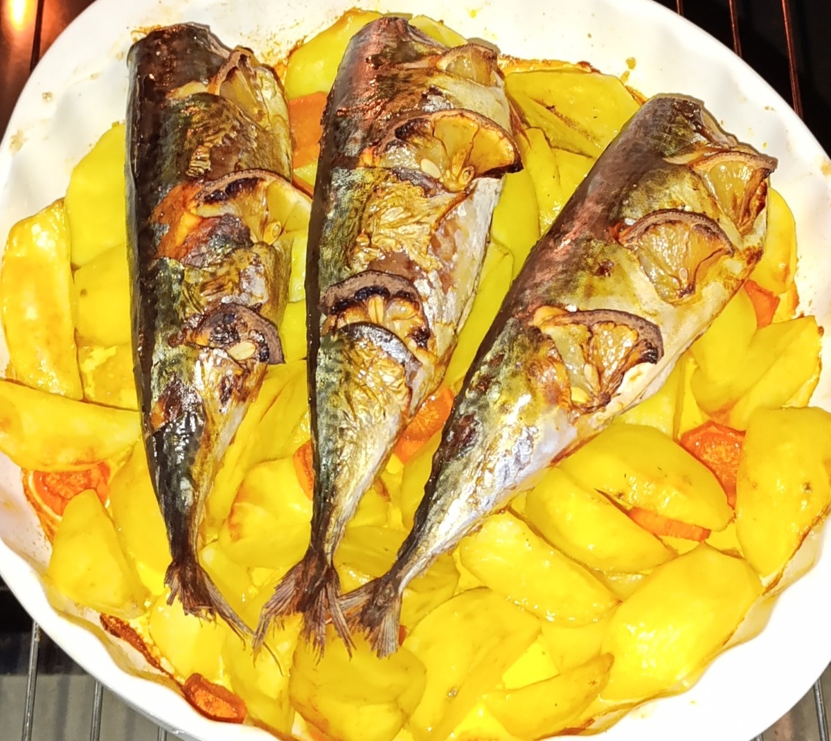 Ингредиенты: скумбрия 3 шт картофель 1 кг морковь 3 шт соль по вкусу паприка 0,25 ч л масло растительное 2 ст л перец черный молотый - немножко (меньше 0,25 ч л) лимон - несколько долек Картофель и морковь очищаем и нарезаем. Смешиваем картофель с паприкой, солью и растительным маслом. Выкладываем в форму для запекания. Скумбрию моем, очищаем от внутренностей. Обтираем солью и молотым перцем. Делаем надрезы, в которые помещаем дольки лимона. Выкладываем на овощи. Запекаем при температуре 165 градусов около 40 минут. Приятного аппетита!!!!! Рецепт запеченной скумбрии без овощей Вы можете посмотреть здесь