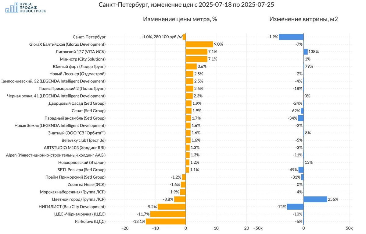 Санкт-Петербург, обзор изменения предложения на рынке за неделю💰 Смотрим без премиум и элит классов. 💵 За 7 дней цена метра снизилась на -1.0% до 280 100 рублей за метр. 📈Топ изменения цен (подорожало): 1️⃣ЖК "GloraX Балтийская" (Glorax Development) цена метра +9.0%, витрина предложения уменьшилась на -44м2 2️⃣ЖК "Министр" (City Solutions) цена метра +7.1%, объем витрины при этом увеличился на 83м2 3️⃣ЖК "Лиговский 127" (VITA ИСК) цена метра +7.1%, объем витрины при этом увеличился на 4458м2 🪫Анти топ (подешевело): 1️⃣ЖК "Parkolovo" (ЦДС) -13.1% в цене, витрина предложения уменьшилась на -468м2 2️⃣ЖК "ЦДС «Чёрная речка»" (ЦДС) -11.7% в цене, витрина предложения уменьшилась на -222м2 3️⃣ЖК "НИГИЛИСТ" (Bau City Development) -9.2% в цене, витрина предложения уменьшилась на -18154м2 ☄️Объем предложения жилья в регионе ниже -1.9% (-27039 м2) Все изменения в регионе на картинке. 🔥 @pulsprodaj