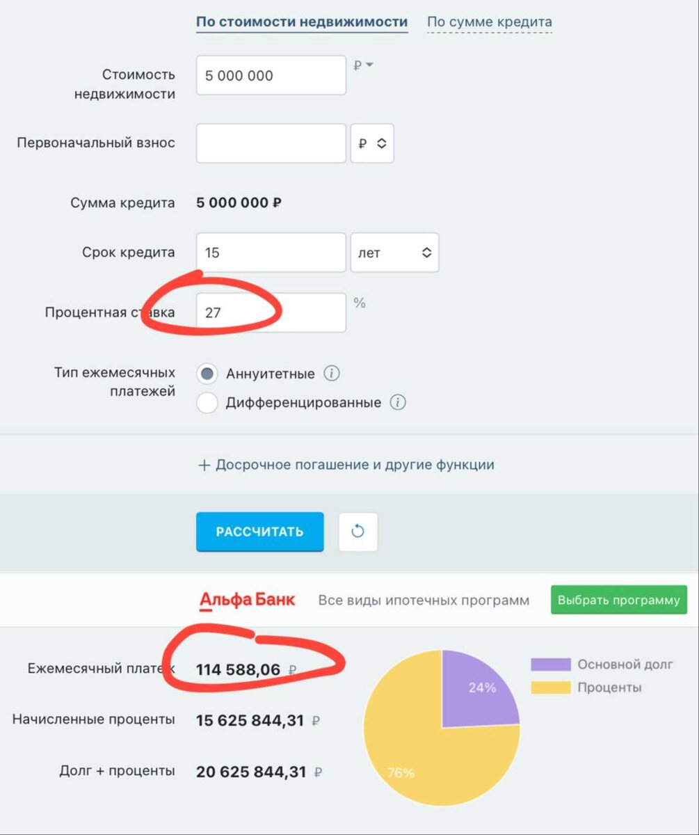 Сравнение платежа по ипотеке при разных ставках. Срок ипотеки - 15 лет Кредитные средства - 5 млн рублей Ставка 27% - 114 588 рублей Ставка 20% - 87 814 рублей Ставка 12% - 60 008 рублей Ставка 8% - 47 782 рубля Времена гос поддержки были очень хороши, когда ипотеку давали всем под ставку 8%. Эта программа вводилась как антиковидная мера в поддержку застройщиков и граждан. Сейчас, реальная, ставка по ипотеке - 22%. После изменения ключевой ставки, по ипотеке можно будет ожидать ставку на уровне 20% в ближайшее время.
