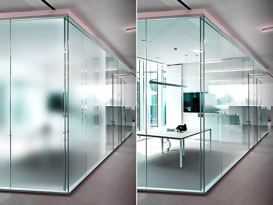 - Офисы и переговорные: приватность одним нажатием, возможность использования стеклянных стен как экрана для презентаций.