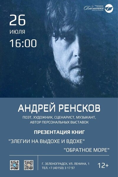 В Зеленоградске в библиотеке им. Куранова 26 июля пройдёт презентация книг Андрея Ренскова «Обратное море» и «Элегии на выдохе и вдохе» (12+). Об этом сообщает муниципальная газета «Волна». «Вечер „Потрясение воздуховодов“ — это встреча разных поэтических практик. Автор двух новых книг „Обратное море“ и „Элегии на выдохе и вдохе“ использует и минимализм, и верлибр, и холостой стих, и рифмованные тексты, и разные ритмические построения. Поэзия Андрея Ренскова многослойна, местами абсурдна и парадоксальна. Тем и интересна», — рассказали в библиотеке. Начало запланировано на 16:00. Вход свободный. Изображение: телеграм-канал газеты «Волна» В марте 2025 года Ренскову вручили диплом III степени в номинации «Лучший иллюстратор» премии «ЛиК-2024» («Литературный Калининград»).