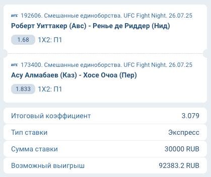 Рубрика #ЛудкасОлегом В эту субботу в Абу-Даби будет жарко, так как с самого детства занимаюсь и увлекаюсь единоборствами, хочу высказать своё мнение по парочке боев на предстоящем турнире. Смешанные единоборства. UFC Fight Night. 26.07.25 Асу Алмабаев – Хосе Очоа (22:00) Асу в полном порядке, вольник, моторный, не тушуется. Очоа - тип, которого в регионалках душили и прокатывали, не говоря про уровень UFC. Тут без чудес, думаю Асу будет валять и мучить его весь бой. Алга алга. Победа Асу Алмабаева за 1,83 Роберт Уиттакер – Ренье де Риддер (00:00) Австралийский Дима Билан (Уиттакер) хоть и не в прайме, но он всё ещё машина. Против него Ренье, который в стойке дерево деревом, да и вообще из другой лиги. Тут или школа решает, или Уиттакер его просто расчеканит по дистанции. Надеюсь после Чимаева зубы починил 😄, но я уверен был, что на дистанции он бы и с ним рубку устроил. Победа Уиттакера за 1,68 Сам рискнул и взял экспрессик, состоящий из двух боёв, хотя можно перестраховаться и