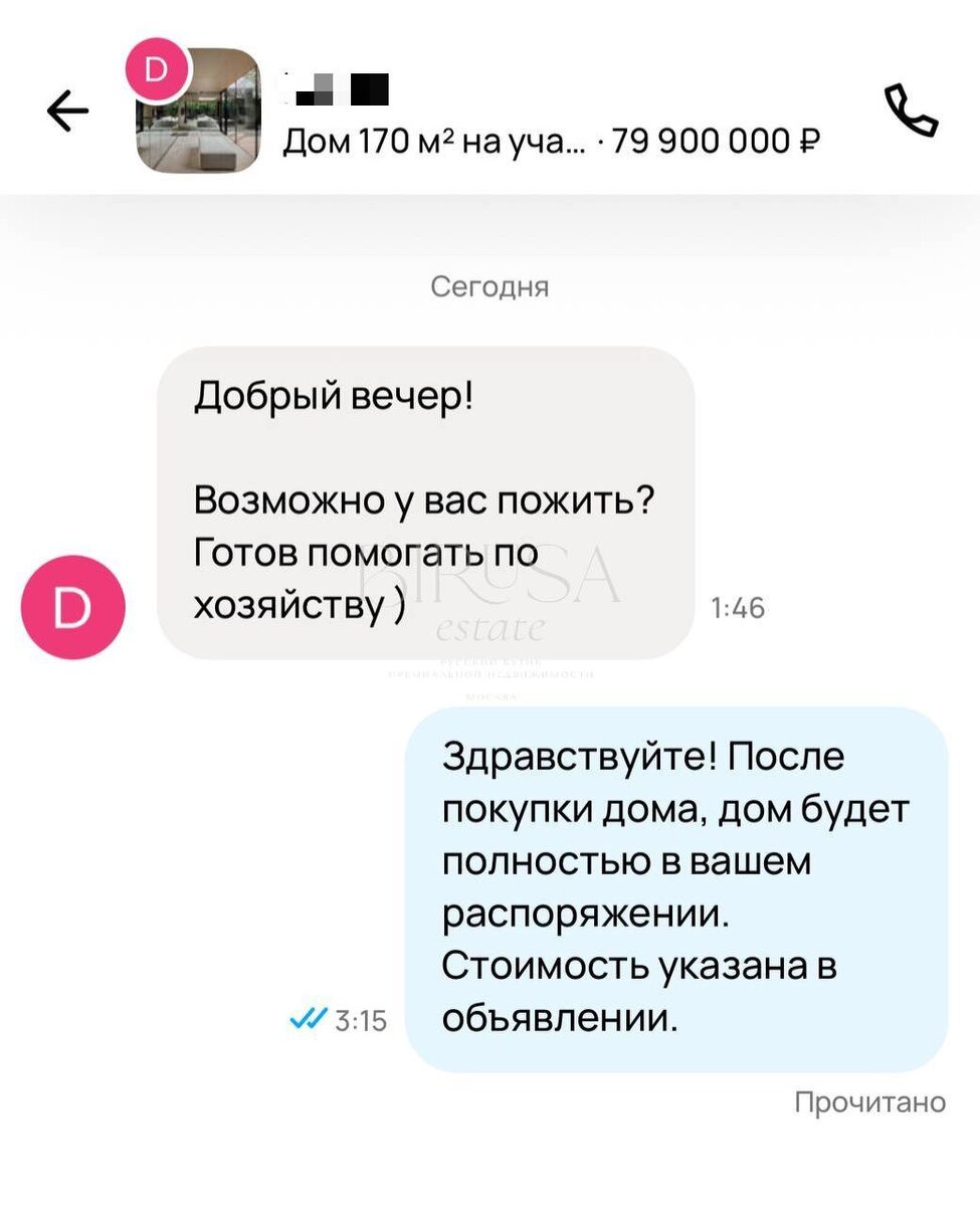 Добрый вечер! Возможно у вас пожить? Когда очень хочется снять дом, денег нет, но есть бесстрашие и отвага! А вам так слабо? Иногда такие сообщения получаем — и не знаем, то ли смеяться, то ли перечитать ещё раз. Пожалуй, пора собирать книгу:«Невыдуманные истории риэлтора. Том 1». И этот диалог — точно пошёл бы в первые главы. А вот, кстати, этот дом в стиле «чёрного квадрата», в который просятся пожить. #яжеблондинка