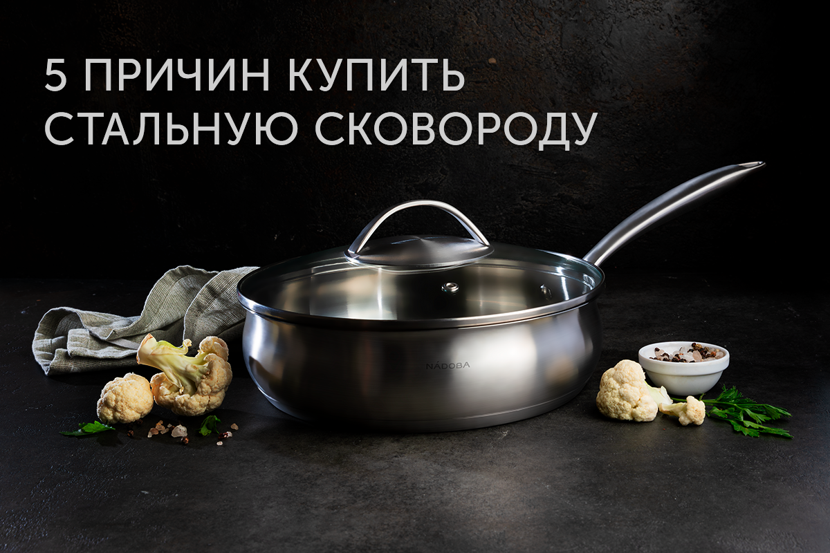 Хорошая сковорода — это верный помощник на долгие годы. Если вы задумываетесь о замене старой посуды или хотите обновить кухонный арсенал, стальные сковороды станут отличным выбором. Они долговечные, универсальные и при правильном уходе прослужат очень долго. В этой статье мы детально разберёмся, почему стоит обратить внимание на стальные сковороды NADOBA. В конце статьи небольшой презент! Стальные сковороды не боятся царапин, устойчивы к деформации и механическим повреждениям. При правильном уходе такая посуда способна служить годами. Сковороды NADOBA изготавливаются из высококачественной стали 18/10, которая не подвержена коррозийным изменениям. Это значит, что изделие долго будет сохранять свой первоначальный вид. Сталь отлично проводник, равномерно распределяющий тепло по всей поверхности посуды, что позволяет готовить самые разнообразные блюда. Сковорода справится с любыми задачами: от быстрой обжарки овощей до медленного тушения мяса. А еще такие сковороды подходят для любых пл