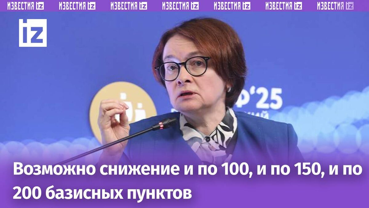 Прогноз ключевой ставки предполагает возможное снижение на оставшихся заседаниях 2025 года. Об этом 25 июля сообщила глава Центрального банка (ЦБ) России Эльвира Набиуллина. «Если вы посмотрите на наш прогноз ключевой ставки, то он предполагает, что до конца года на отдельных заседаниях возможно снижение и по 100, и по 150, и по 200 базисных пунктов. Равно как и паузы», — отметила она. По ее словам, всё будет зависеть от поступающих данных. Набиуллина подчеркнула, что равномерная траектория снижения может быть при более убедительной картине стабилизации инфляции и инфляционных ожиданий на низком уровне, а также отсутствии новых инфляционных шоков.