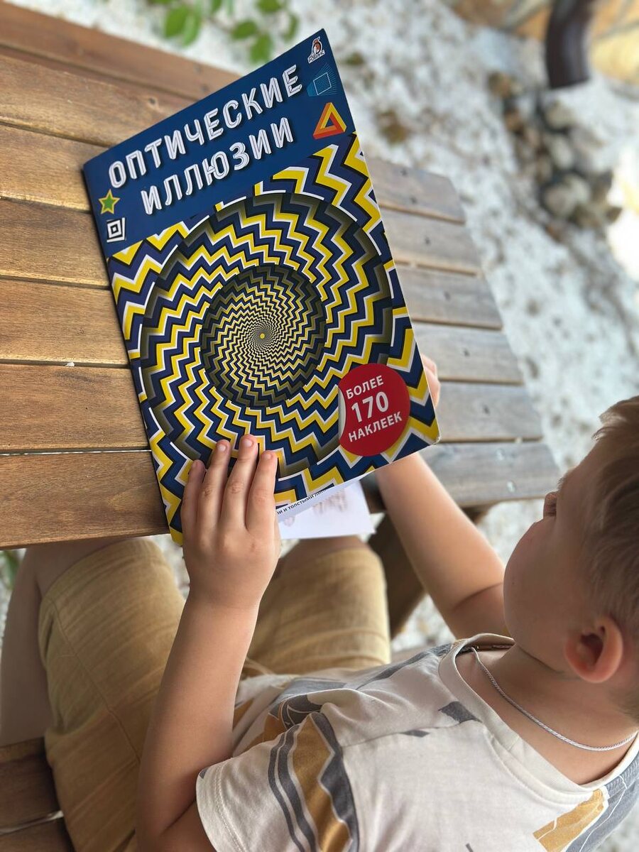 Стикербук с оптическими иллюзиями 🔮 🟠🟤⚪️🔵🟠🟤⚪️🔵🟠 Сын просто залип - клеит наклейки с интересом, и на глазах рождаются настоящие визуальные фокусы ✨ Уже много успели сделать, и каждый раз - «Вау, мама, смотри!» WB OZON | ~ 430₽