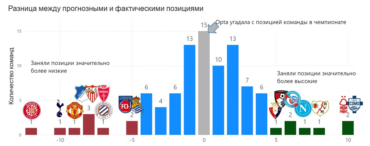 Opta верно предсказала итоговые позиции для 15 из 96 клубов топ-5 лиг. В большинстве случаев расхождения между прогнозом и реальностью составили лишь 2-3 строчки в турнирной таблице. Статистическое распределение ошибок выглядит нормальным — 60% команд уложились в рамки ±2 позиций от прогнозируемых, что свидетельствует о высокой надежности модели Opta. Однако, не обошлось без аномалий — сильных отклонений от прогноза, за это мы и любим футбол, правда?