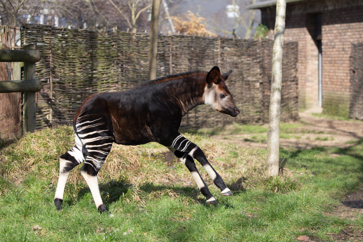 - Диета: Это травоядное животное. Его меню состоит из листьев, почек, фруктов, папоротников и грибов — всего более 100 видов растений. Чтобы переваривать такую жесткую пищу, у окапи, как у коровы, четыре желудка. За день он съедает от 20 до 30 кг растительности, а также лижет глину по берегам рек, чтобы получить необходимые минералы и соль.