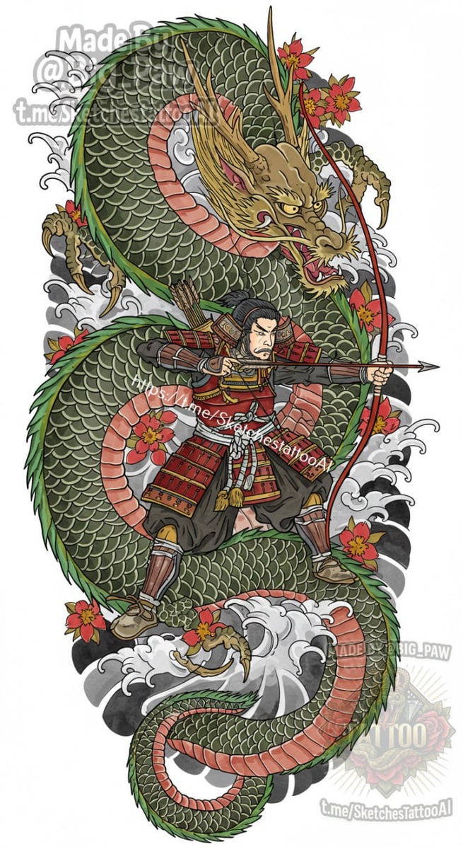 #2629 Подборка по запросу подписчика - Знак зодиака : Стрелец в год дракона в японском стиле , по возможности чтобы дракон обвивал . Цветная 🧠 SYNTX 💳 Донат 😎 НейроБро 😎 Эскизы без вотера 💀 Эскизы от нейросети #япония #дракон #цветная #эскиз #тату #татуировка