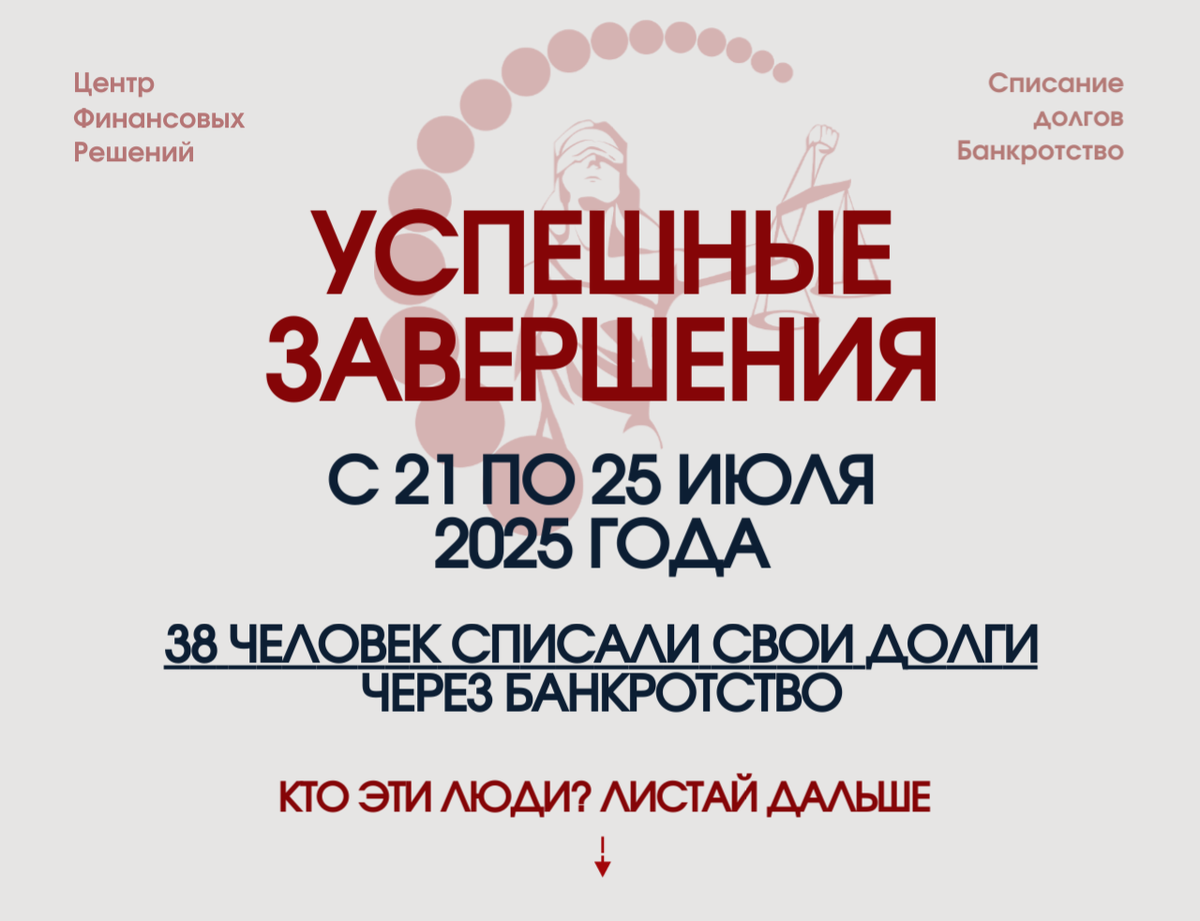 С 21 по 25 июля 2025 года ещё 38 человек избавились от долгов и начали новую жизнь без финансового груза! Полный список тех, кто прошёл путь до конца: ✔️ Айдимирова Рукият Сурхаевна — 799 257 ₽ 📄 А15-7361/2024 ✔️ Ахмедов Артём Витальевич — 1 170 694 ₽ 📄 А32-48401/2024 ✔️ Аванесян Светлана Рубеновна — 5 079 235 ₽ 📄 А32-33482/2022 ✔️ Батчаева Елизавета Хаджибековна — 836 409 ₽ 📄 А25-4006/2024 ✔️ Бежанова Альбина Хсарбеговна — 465 202 ₽ 📄 А61-8223/2024 ✔️ Бечелов Альберт Алексеевич — 977 095 ₽ 📄 А20-6612/2024 ✔️ Визиряко Руслан Павлович — 2 540 479 ₽ 📄 А32-43954/2024 ✔️ Газзаева Наталья Михайловна — 474 628 ₽ 📄 А61-6806/2022 ✔️ Делок Нуриет Темботовна — 863 347 ₽ 📄 А01-5049/2024 ✔️ Денисова Марина Владимировна — 223 397 ₽ 📄 А32-5079/2024 ✔️ Джаримок Маргарита Эдуардовна — 384 575 ₽ 📄 А01-4258/2024 ✔️ Караев Марат Вячеславович — 205 369 ₽ 📄 А61-2129/2024 ✔️ Клюквина Марина Сергеевна — 687 433 ₽ 📄 А63-3950/2024 ✔️ Кобзарь Татьяна Григорьевна — 1 775 784 ₽ 📄 А01-3673/2024 ✔️ Ко