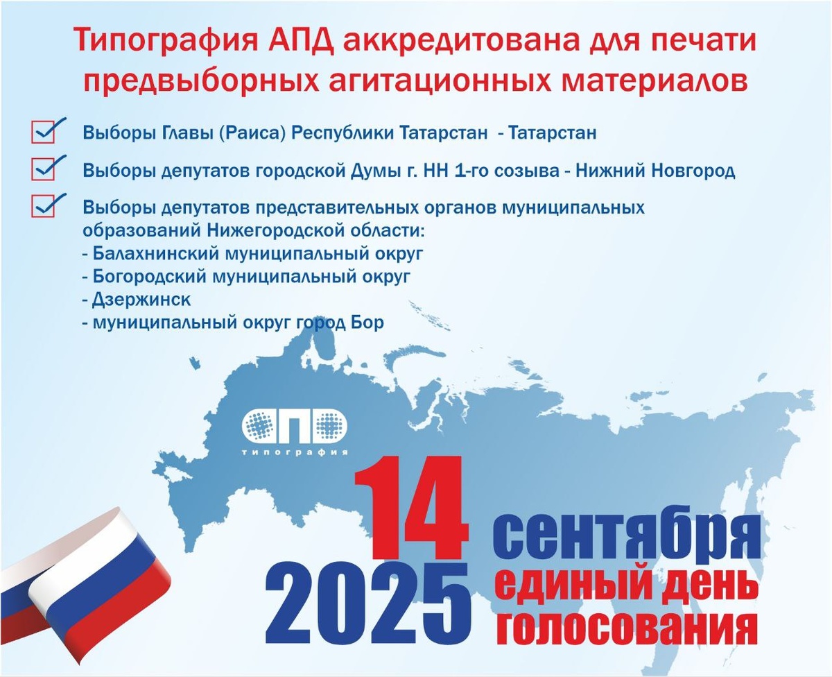 💼 Аккредитованная типография для изготовления печатных материалов для предвыборной кампании ЕДГ 14 сентября 2025. 🇷🇺 Выборы Главы (Раиса) Республики Татарстан - Татарстан 🇷🇺 Выборы депутатов городской Думы г НН 1-го созыва - Нижний Новгород 🇷🇺 Выборы депутатов представительных органов муниципальных образований Нижегородской области: - Балахнинский муниципальный округ - Богородский муниципальный округ - Дзержинск - муниципальный округ город Бор Типография АПД: т. 8 800-444-26-40 сайт ✅️ apd52.ru вк ✅️ vk.com/apd52 почта✅️ zakaz@apd52.ru Telegram ✅️ https://dzen.ru/id/686269be27fe32442d7d2188 #апдтипография #типографияапд