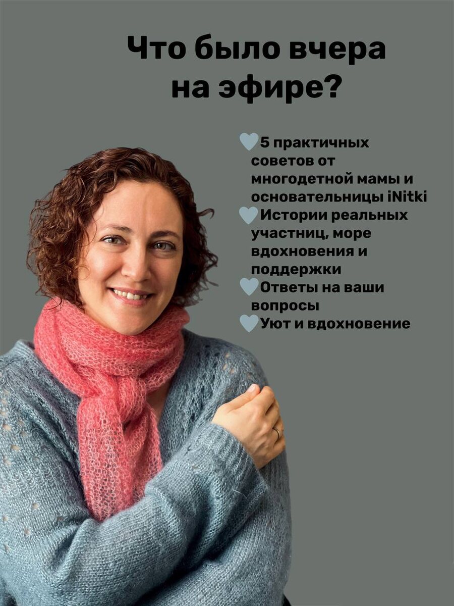 Запись эфира: уже доступна в закрытом канале сообщества iNitki 🔥 Не смогли вчера прийти? Понимаем вас! Поэтому мы сохранили запись для всех вязальщиц! Вчера на встрече поговорили о самом важном: 🧶 Как вязать по 15–30 минут в день и получать радость 🧶 Как настроить пространство и ритм под себя 🧶 Как не чувствовать вину за недовязы Эфир уже доступен в нашем закрытом канале. Смотреть эфир: https://t.me/+CrQH6nKZvOo1MTNi А уже 30-31 июля 18:00 по мск встречаемся снова с Яной Бардок и создаём прекраснейший быстрый проект — чехол на кружку. 🎀 «Вязальный планер» — подарок при регистрации на практикумы. Это не просто файлик, а целый трекер, который поможет вам запланировать проекты! 👉 А тем, кто будет онлайн на встрече, подарим БОНУСЫ: 30 июля: «ТОП-10 схем спицами для продвинутых вязальщиц» 31 июля: «Гайд по выбору идеальной пряжи и спиц» РЕГИСТРАЦИЯ